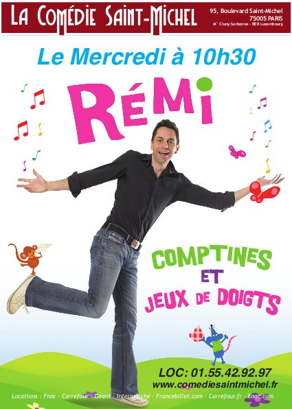 Retrouvez Rémi le chanteur des petits à la Comédie Saint-Michel (Paris) les mercredis à 10:30 dans Comptines et jeux de doigts, un spectacle jeune public, ludique et interactif pour chanter, mimer, danser et s’amuser. Les enfants rencontreront la souris verte, le grand cerf, les petits poissons, un petit escargot, et bien d’autres ! Des chansons tendres de la tradition enfantine à partager en famille…