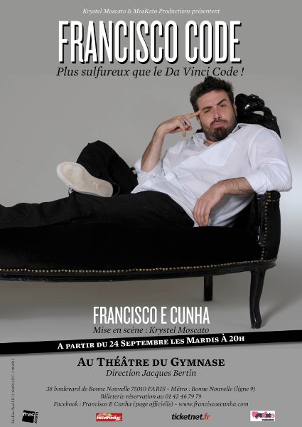 Francisco E Cunha fait partie de la nouvelle génération du rire et arbore aussi le costume de professeur de théâtre. Entre ses délires paranoïaques et son talent d’acteur, Francisco vous laisse pénétrer dans son univers véritablement déjanté. Après la Cigale, les Folies Bergères ou encore l’Olympia pour les premières parties de Vincent Moscato et Olivier de Benoist, Francisco E Cunha pose ses valises dans une autre célèbre salle le Petit Théâtre du Gymnase tous les mardis jusqu’au 31 Décembre 2013.