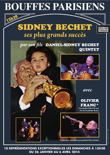 Daniel Sidney Bechet, le fils de Sidney Bechet, et Olivier Franc (Prix Sidney Bechet de l’Académie du Jazz, Prix du Hot Club de France) interprètent en quintet tous les succès de Sidney Bechet qui ont marqué l’histoire du jazz, le concert étant parsemé d’anecdotes. Olivier Franc, qui joue sur le saxophone personnel de Sidney Bechet, est aujourd’hui reconnu dans le monde entier comme le meilleur représentant de sa musique, invité par des stars de la Nouvelle Orléans lors d’une soirée spéciale Sidney Bechet à New York ou par Wynton Marsalis sur la grande scène du festival Jazz in Marciac. Une soirée exceptionnelle pour tous ceux qui aiment le jazz Nouvelle Orléans et Sidney Bechet.