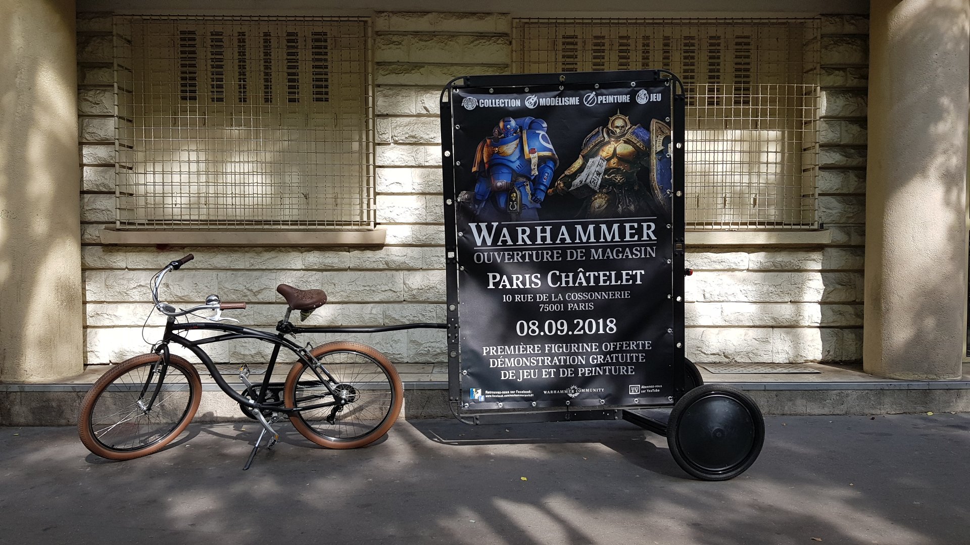 Opération de street marketing avec un vélo publicitaire d’affichage mobile urbain pour l’ouverture du magasin Warhammer dans le quartier du Châtelet à Paris.
